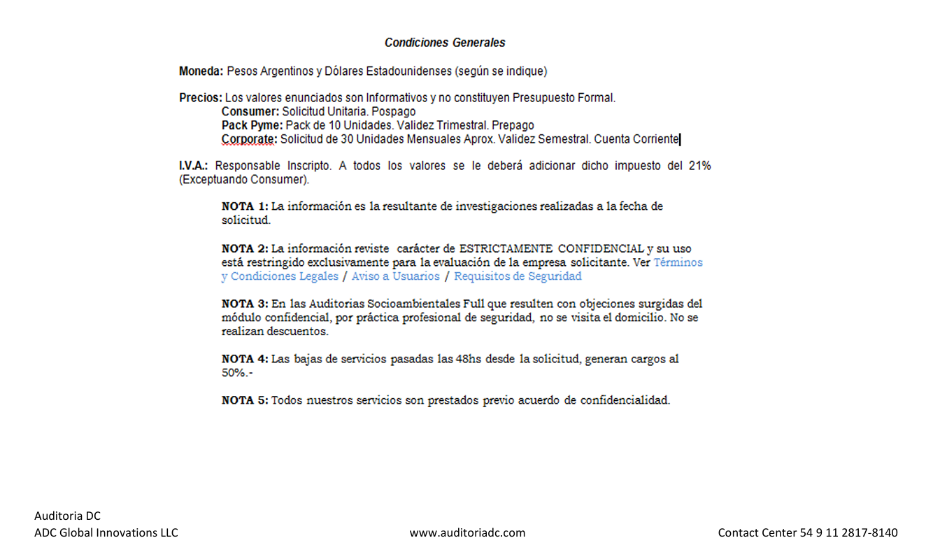AUDITORIADC estará autorizada a suspender la prestación de cualquier servicio sin previo aviso en caso de retraso en el pago.